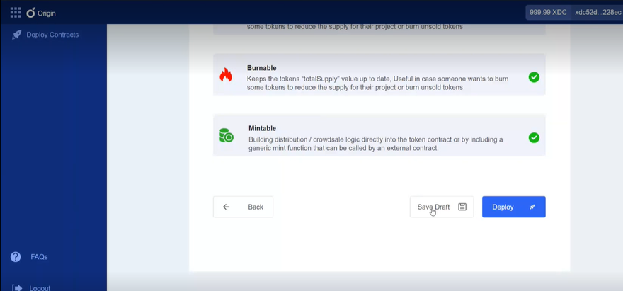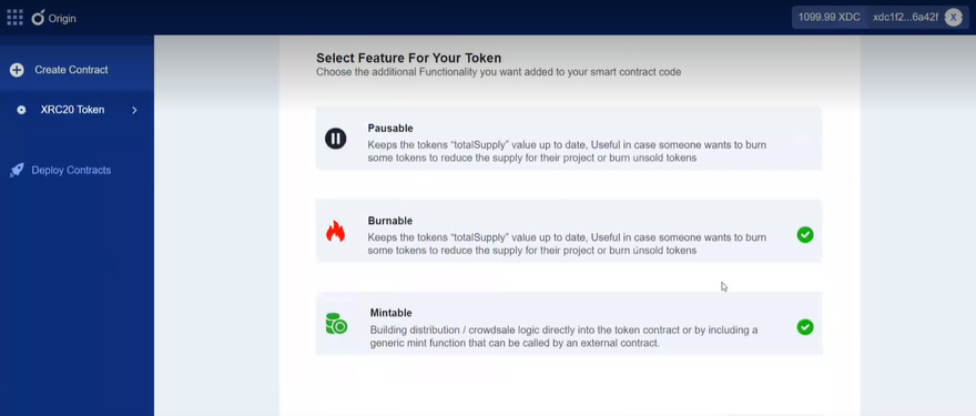 XDC Origin offers you a choice of functionality for your smart contract. It applies Burnable and Mintable functionality by default; however, you can choose Pausable based on your requirements.