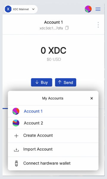 Below the account's name: Account 1, there's a random character string: Xdc58... It is your account's wallet address. The address is copied onto your clipboard if you click on it.