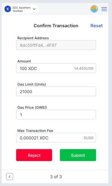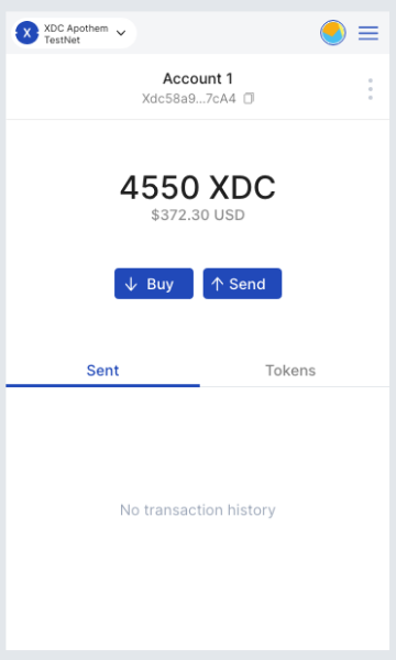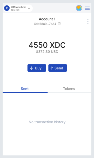 From here, you can also edit the gas fee to make your transaction faster. Here, we are sending 0.457 XDC to Account 1. Click Confirm and your transaction will be processed and show up on your Transaction History on the main interface.