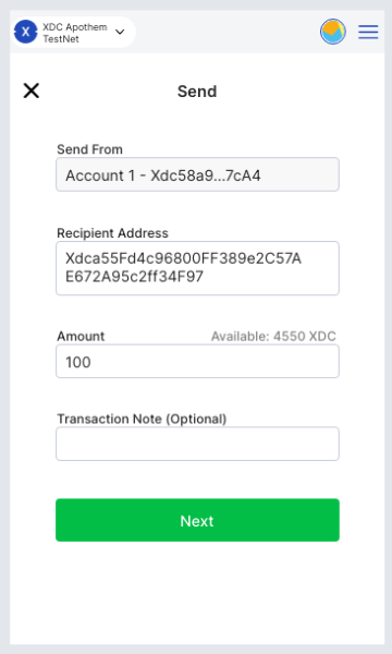 The 'Send' button on the Apothem Network will send you to this interface. In the example, Account 1 has 100 XDC, and by hitting the recipient address input text, you'll be able to choose or paste an address.