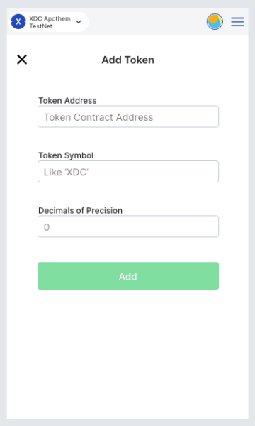 From the main interface, go to the top left menu icon beneath the 'Home' button. You can add a token that you made from an XRC20 standard contract, or you can search for someone else's token. Assuming that you have one already, let's go with adding your own first.