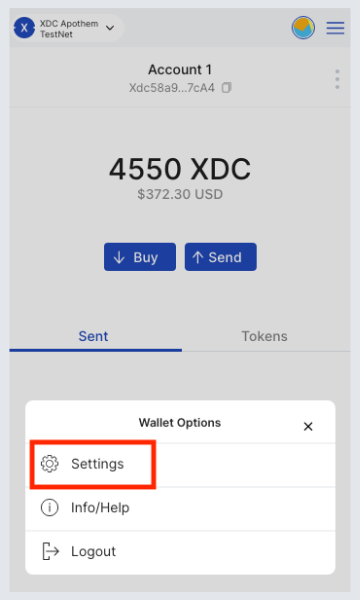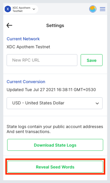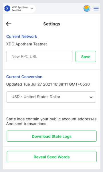 The interface shown above will appear initially on the Settings tab. Without scrolling, you'll be able to see the Primary Currency section from the fiat radio button, switch it to XDC. If you go back to your main interface by clicking the head button, it should change to: