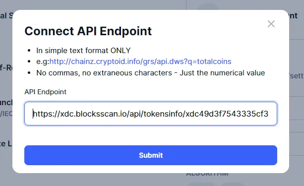 Replace with the address of the XRC token contract whose circulating supply you want to update in other platform like CMC and enter “circulatingsupply” or “totalsupply”, whichever you want to update. This API endpoint will return the current circulating supply | totalsupply of the specified token.