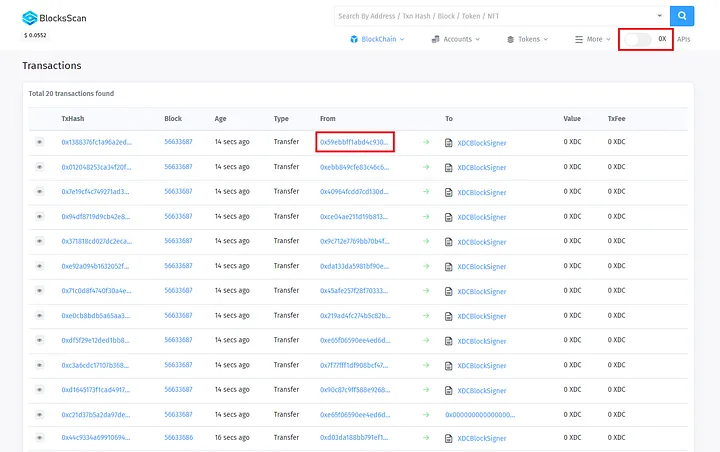 Now, users have the option to view transactions with either the ‘0x’ or ‘XDC’ prefix according to their preference on the XDC Apothem Network. This choice empowers users to tailor their experience and aligns with our commitment to providing a flexible and user-centric environment.