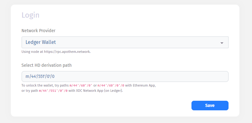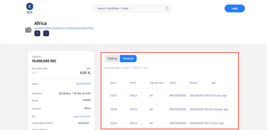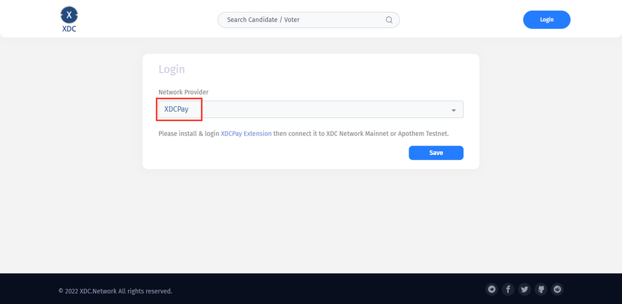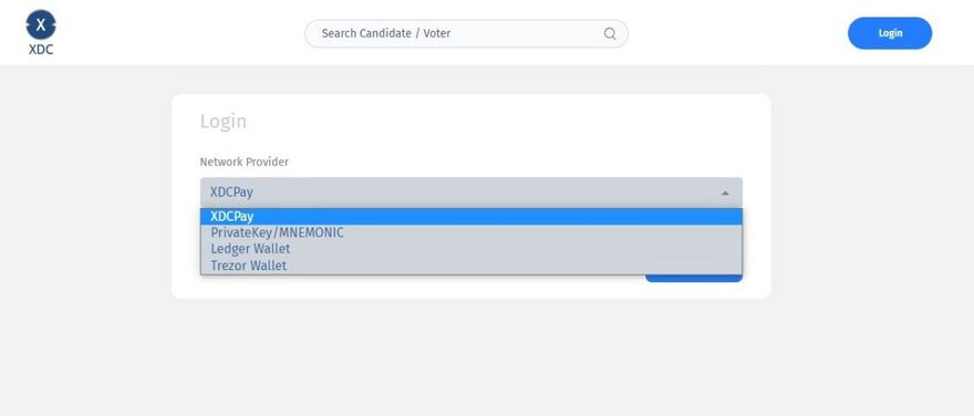 Masternode owners can Log in to the Masternode app using the XDCPay, Private Key, Ledger Wallet, or Trezor Wallet.