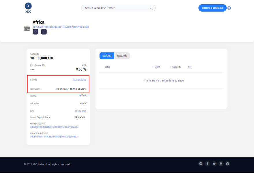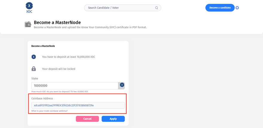 To set up a Masternode on XDC Network, ensure your XDC protocol running node is publicly identified and through the compliance process. Every Node Holder needs to upload a KYC document, and this detail will be visible to the public network. To find more information visit the guide to set up masternode on XinFin XDC Network.