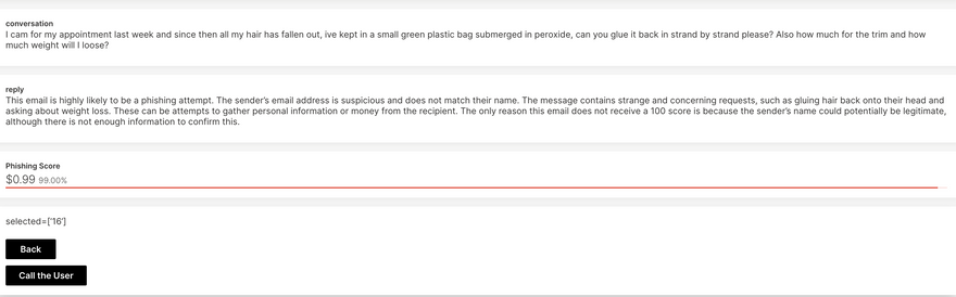 you can click on the call user button to call the user, to let them know about the phishing email and how to react to it. The AI Assistant converses in realtime with the user