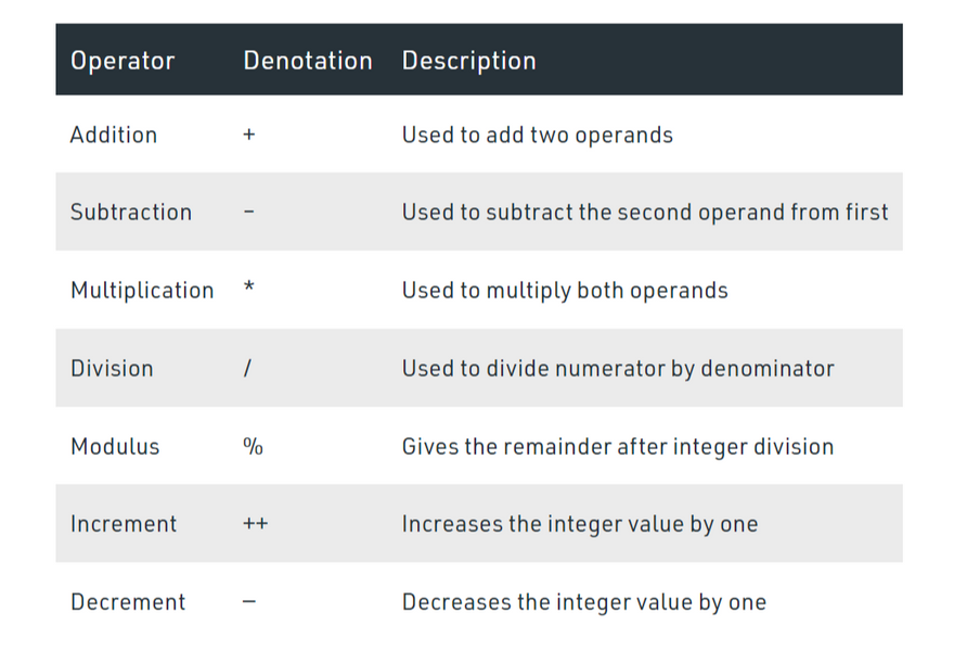 These operators are used to perform arithmetic or mathematical operations. Solidity supports the following arithmetic operators: