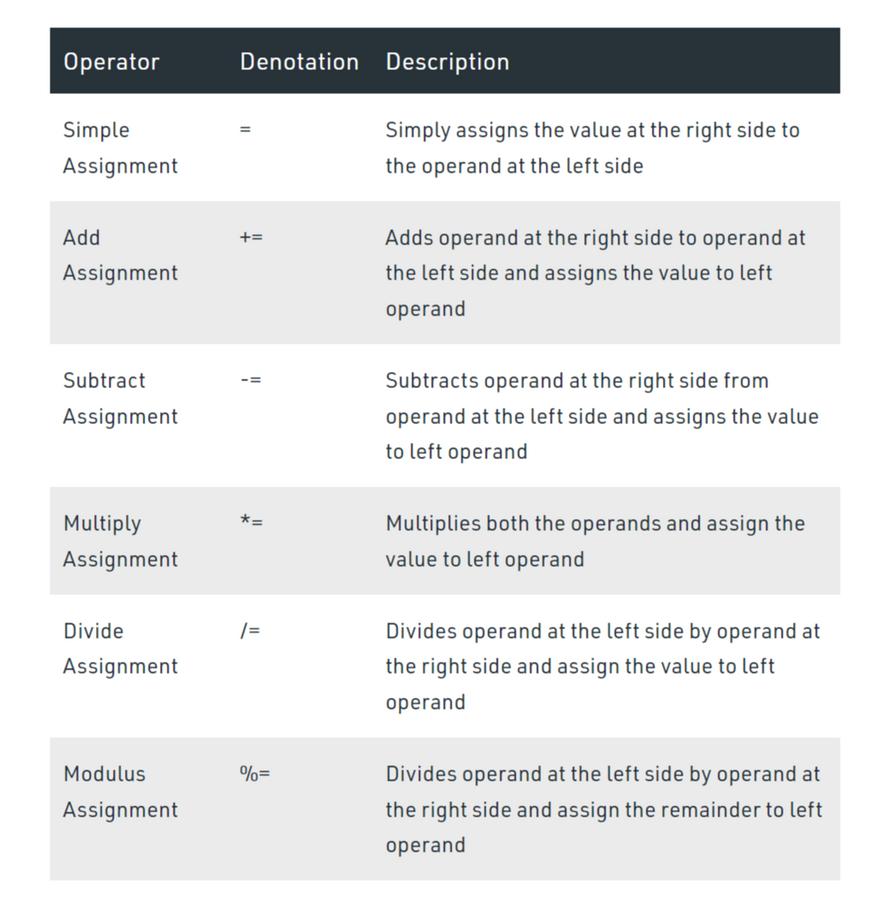 These operators are for the assignment of value to a variable. The operand at the left side is variable while operand at the right side is value. Solidity supports the following arithmetic operators :