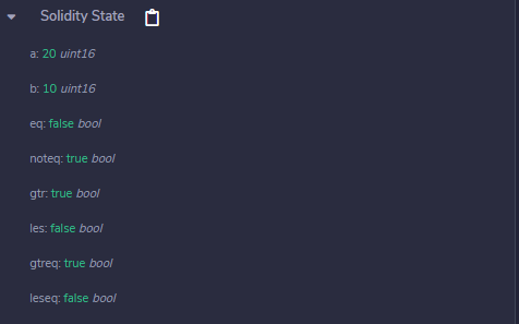 Example: In the below example, the contract SolidityTest demonstrates the above mentioned different types of relational operators.
