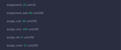 Example: In the below example, the contract SolidityTest demonstrates the above mentioned different types of assignment operators.