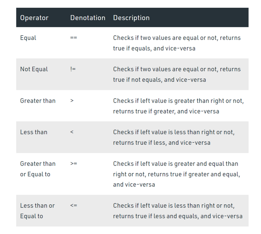 These operators are used to compare two values. Solidity supports the following relational operators: