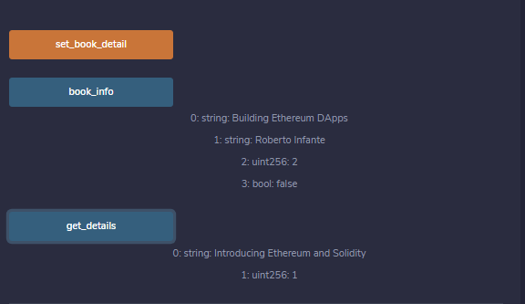 Example: In the below example, the contract Test consists of a structure Book, and functions are defined to set and get values of the elements of the structure.