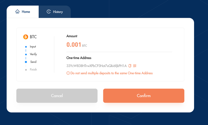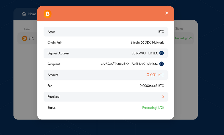 once the bridge has confirmed finality on BTC, it will set about minting xBTC on XDC Network. At this point, Processing 1/2 will change to Processing 2/2