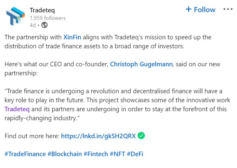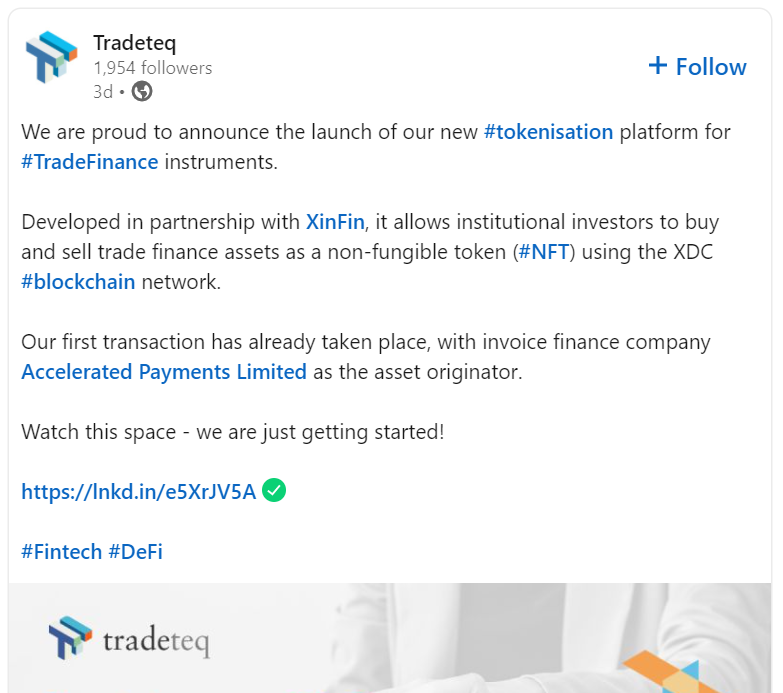 Xinfin has partnered with Trade Teq, a Europe-based company, to offer tokenized trade finance products to institutional investors. This trade finance transaction on Xinfin (XDC Network ) is the first end-to-end trade finance-based non-fungible token (NFT) transaction adhering to a set of regulatory guidelines and trade finance standards. Thus, it has embarked upon a new journey, opening up opportunities for market participants to further the innovation in the trade finance distribution space, especially around DLT.