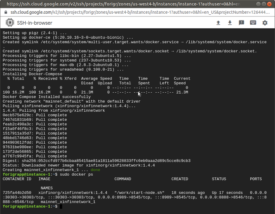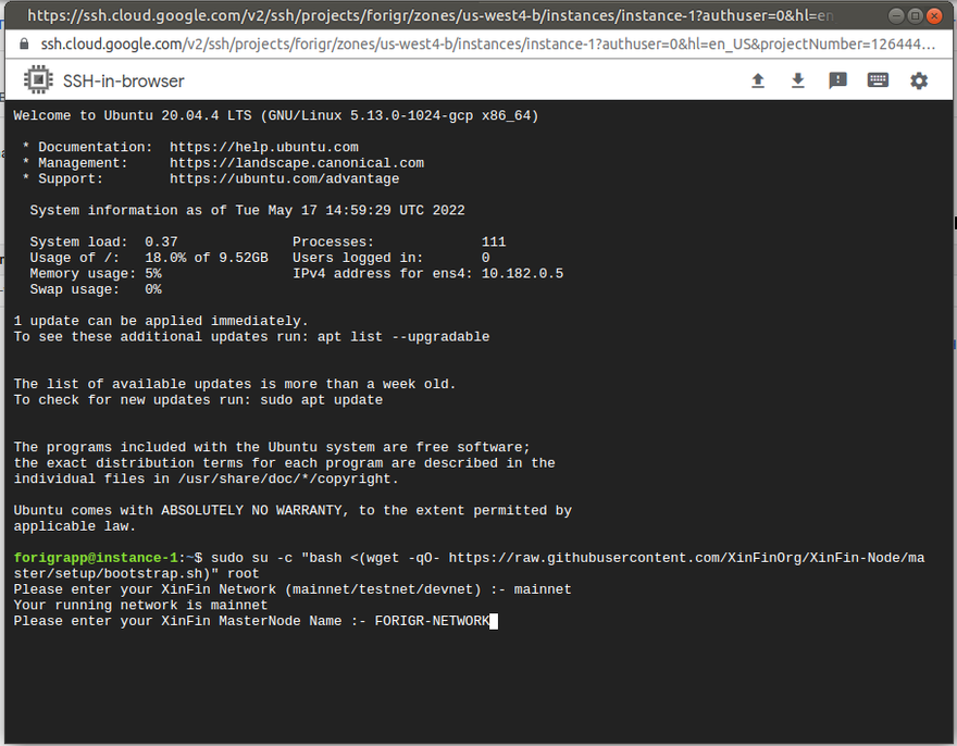 Connect to your Google Cloud instance and run the install script. Enter XinFin Network “mainnet”, and your Master Node Name