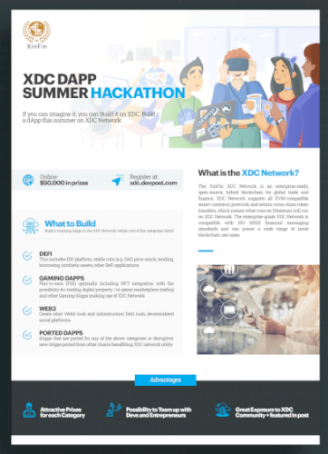 In this hackathon, you’ll learn the capabilities of the XinFin network and the innovative products and technologies that have been developed that make up the XinFin Network. Use this hackathon as an opportunity to expand your knowledge of blockchain and create applications that are highly efficient and trusted globally.