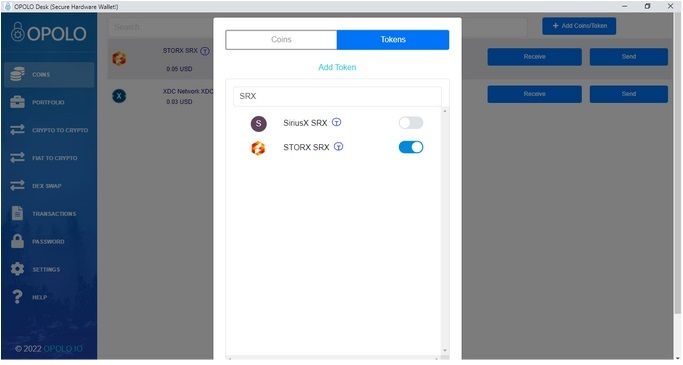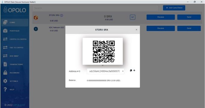 After adding the SRX token you can receive and store the SRX tokens on OPOLO hardware wallet and also make sure you have some XDC tokens as a gas fee for the transaction