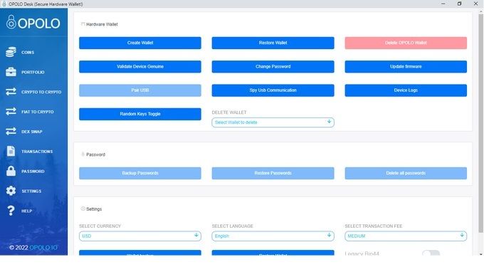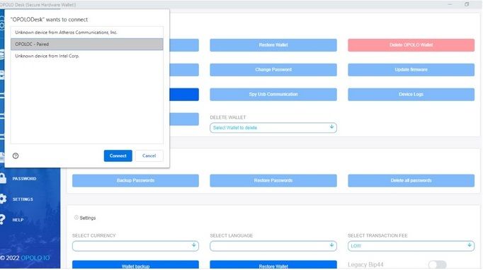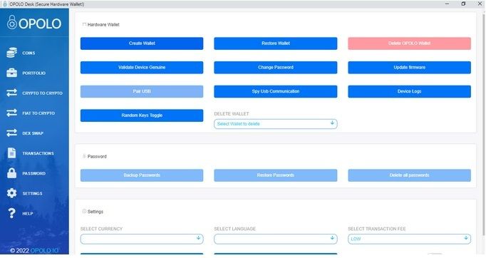 Step 9 :- Now if the device is successfully paired, you will be able to see the Settings page of OPOLO Desk and Press the button “Create New OPOLO Wallet”