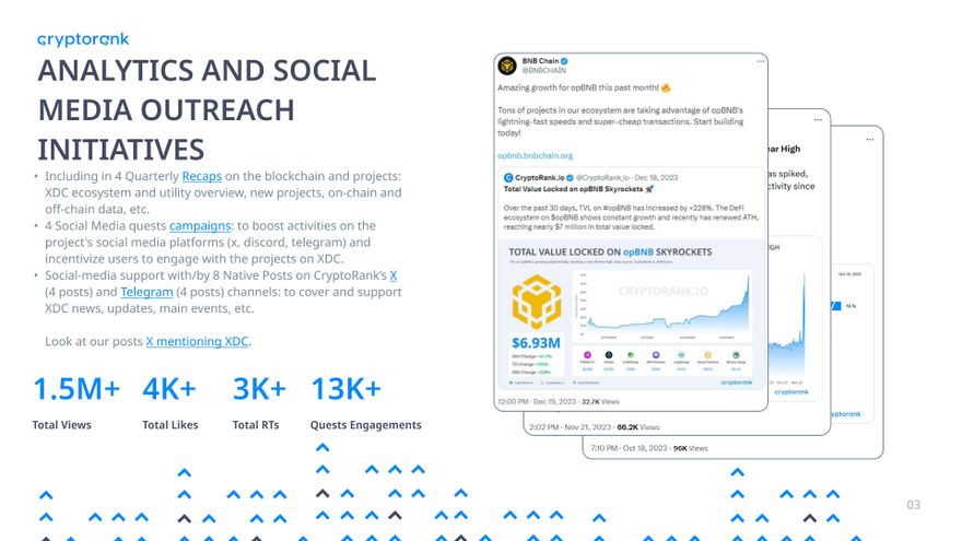 Social media support via totally 8 native posts on CryptoRank’s X and Telegram channels to highlight XDC’s ecosystem, updates, main events, etc., with simultaneous announcements on our Twitter and Telegram news channels.