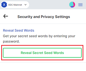 Step 4: By clicking on the “Reveal Secret Seed Words” you will be able to recover your XDCPay Wallet.