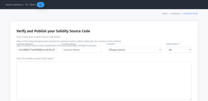 Click on the “Verify And Publish” link. You will be automatically redirected to the Contract verification page with your Contract address.