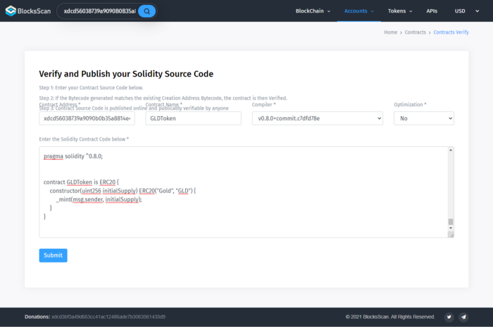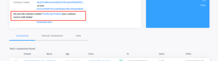 Step 5: Once you are on XDC Explorer, it will ask users to verify their contract. To verify the smart contract, Click on the “Verify And Publish” link. You will be automatically redirected to the Contract verification page with your Contract address.