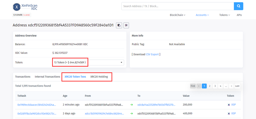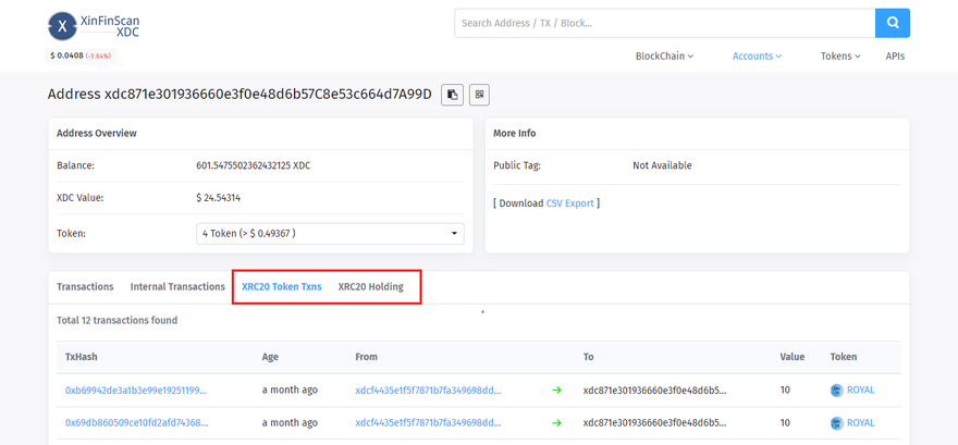 The address which contains the XRC20 tokens will display the token transactions and hold tokens in a tab named XRC20 Token Txns and XRC20 Holdings respectively.