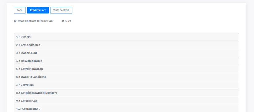 - To read the Contract, visit the “Read Contract” tab. Users can get the information by fulfilling the requirements like address and all. A total of 25 getter functions are available.