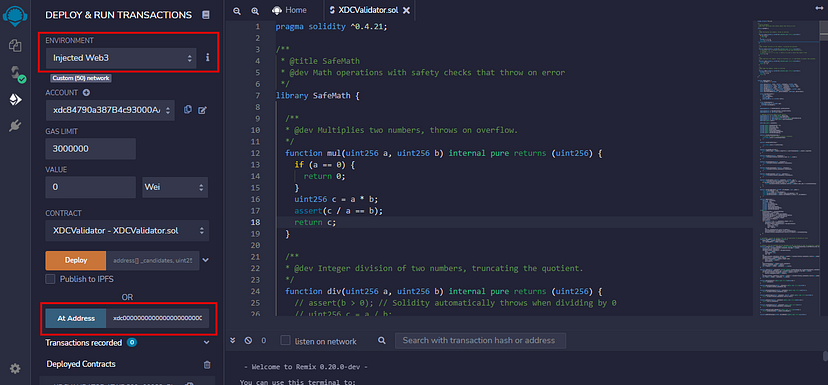 - Enter the XDCValidator Contract address(xdc0000000000000000000000000000000000000088) in front of “At Address” field and click on “At Address” button to access the Function of the XDCValidator Contract.