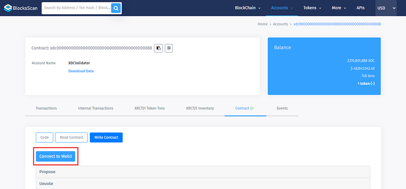 - To Interact with the XDCValidator Contract, visit the “Write Contract” tab.