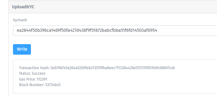 Step 2: Now they need to Upload their KYC by calling the “UploadKYC” function, here user needs to enter the “KYC Hash.”