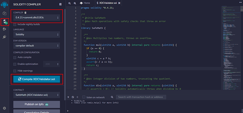 Step 3: Visit Compiler tab, Select the compiler version and click on “Compile XDCValidator.sol”