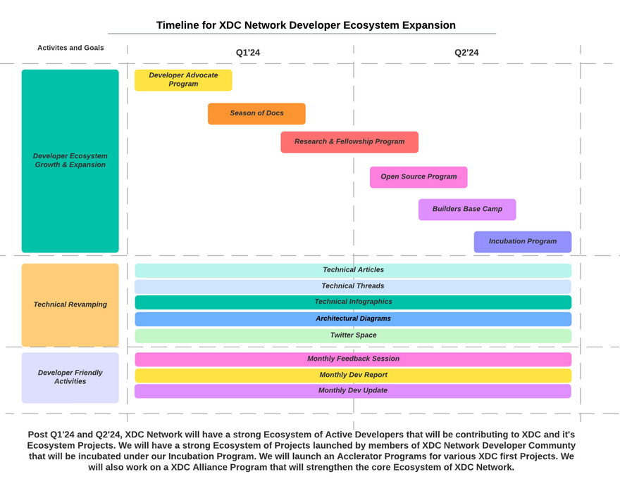 We have divided our efforts for these two quarters into two sets of 3 months each. From the start, we will focus on various aspects to boost the on-chain developer adoption of XDC along with Boosting the quality and quantity of projects on XDC. We will start with various Technical Revamping activities to create better Technical documentation/threads of XDC for the developers. Continue with this; we have various programs planned, like the Season of Docs Program, Open Source Program, Research and Fellowship Program, etc. All these activities will bring in very good results for the XDC ecosystem and present the narrative of the XDC Network.