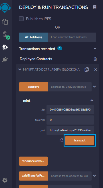 To mint NFT, access "mint" function, enter "_to" address, "_tokenId" & "_uri" and click on the transact button to complete the minting.