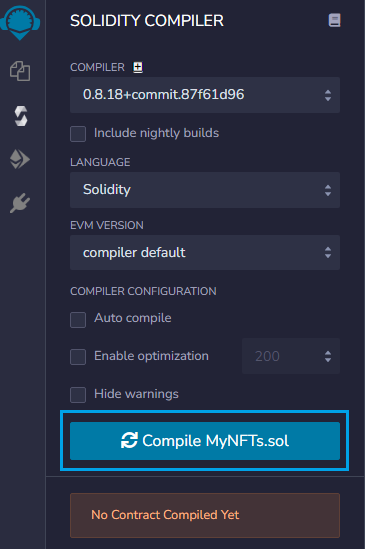 Select a proper compiler version, language as Solidity and click on the "Compile MyNFT.sol" button.