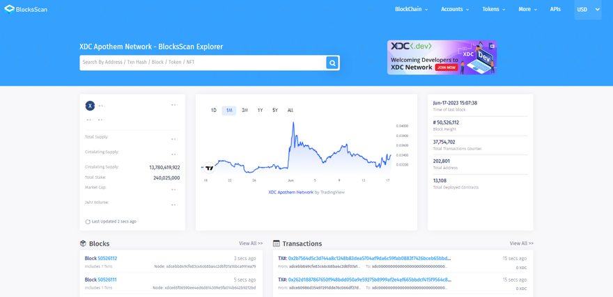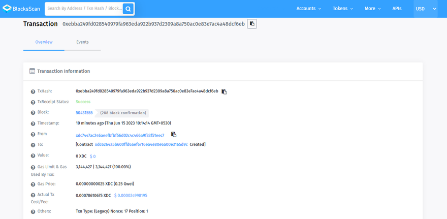 Once the deployment is successful, Remix will provide you with the transaction hash and the deployed contract address. These details allow you to interact with your contract on the XDC Apothem network. Additionally, if you want to explore and monitor your contract's activity, you can easily track it on the BlocksScan Explorer. Simply enter your contract address in the explorer's search bar, and you'll gain access to a comprehensive view of your contract's transactions and other relevant information.