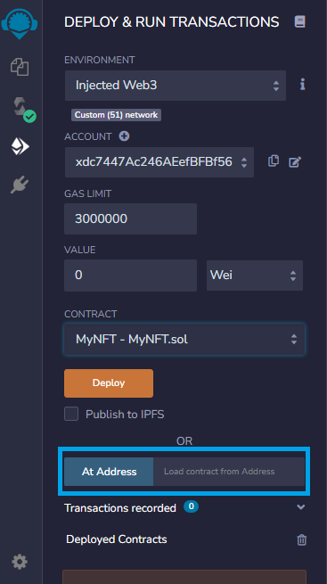 To interact with a contract, copy the Contact address, visit XinFin Remix, enter the contract address into the "At address" input field, and then click on the "At address" button.