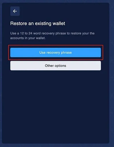 Step 2: After clicking on the restore existing wallet button, the user will be able to see ‘’Two’’ options. Now, Click on the “Use recovery phrase” option.