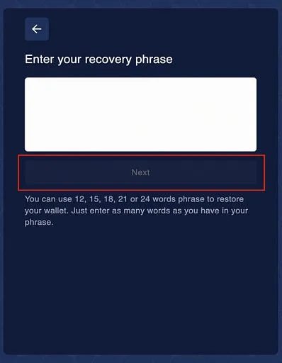 Step 3: Here, users need to enter their recovery phrase(Seed Phrase words). Once entered, click on the “Next” button.