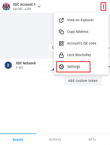 Step 1: It is very easy to take a backup of your BlocksPay wallet, click here on the ‘’THREE ‘’dots and then visit the “Settings” tab.