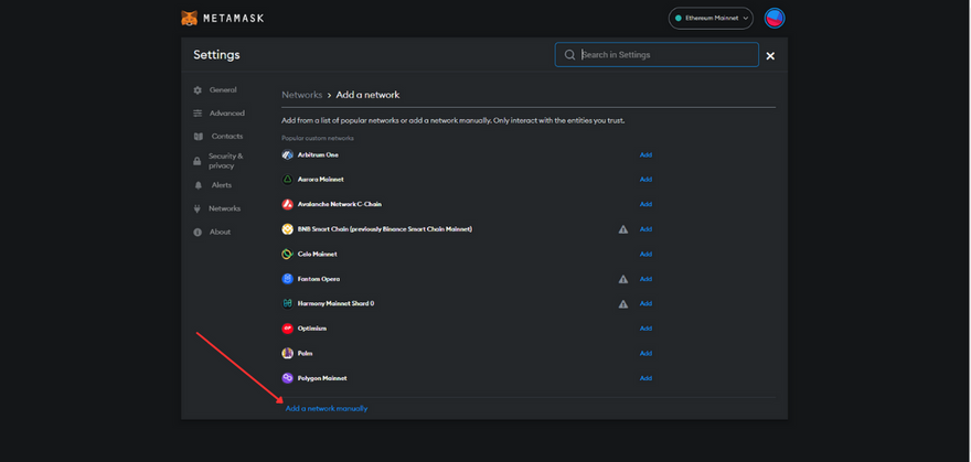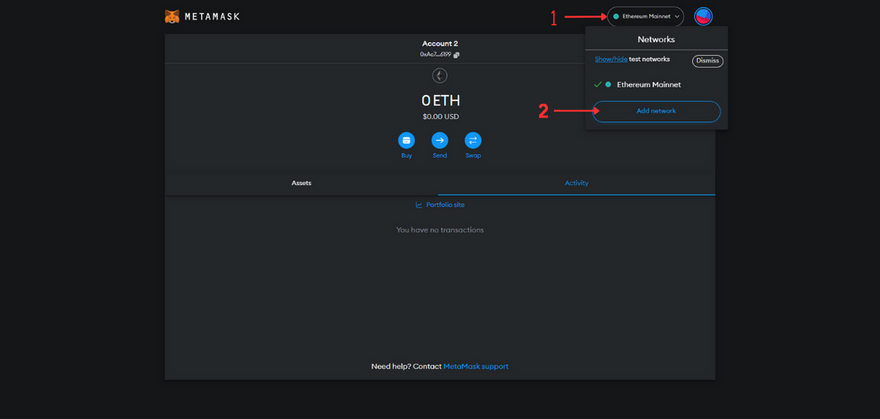 Click the network drop down, which should say Ethereum with a down arrow, and select add network.