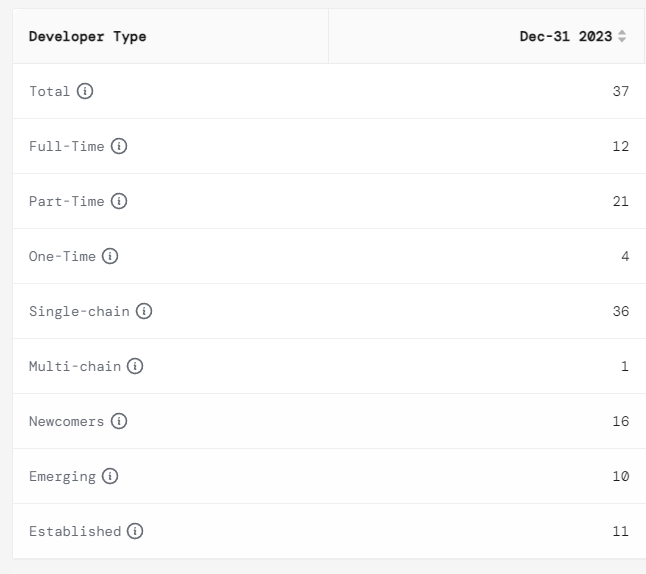 In addition to single-chain and multi-chain, there are three new metrics that provide insight into the experience level and growth of developers within an ecosystem. These metrics help identify newcomers, emerging, and established developers. Newcomers are identified as developers that have contributed for less than a year, emerging have contributed for 1-2 years, and established more than two years. Collectively, these new metrics allow you to identify and categorize developers more accurately.