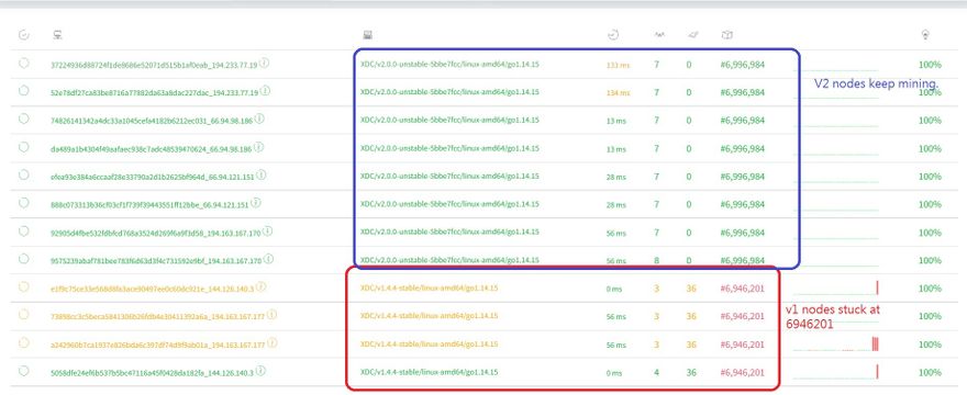 I upgraded 8 nodes to v2, including 6 Masternodes. And keeps 4 Masternodes in v1 version (v1.4.4).