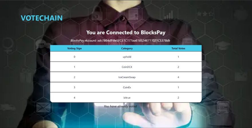 This is to present a groundbreaking project that has the potential to revolutionize the way we conduct voting: VoteChain.VoteChain is not just another voting application; it's a manifestation of innovation, security, and efficiency. By leveraging blockchain technology through platforms like Blockspay and Truffle XDC, VoteChain ensures the integrity and transparency of the voting process.One of the key features of VoteChain is its cost-effective model. With just 0.3 XDC required to cast a vote, it makes participation accessible to everyone while still maintaining the security and validity of each vote.Moreover, VoteChain incorporates a chatbot interface, enhancing user experience and accessibility. This integration streamlines the voting process, making it intuitive and user-friendly for individuals of all backgrounds.