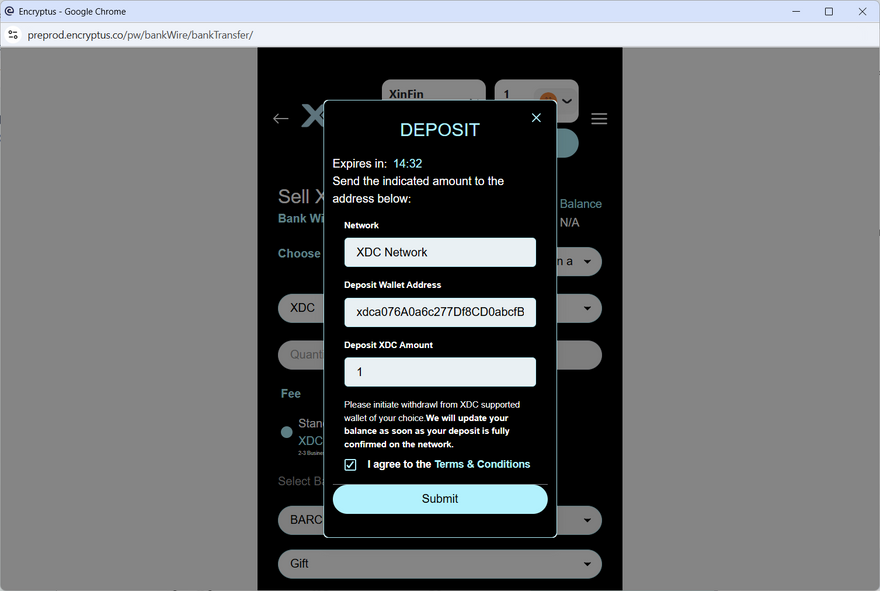 yo, im trying to deposit XDC to XDCcash for trial run for when i want to off ramp but the submit button does not work..screenshot attached.