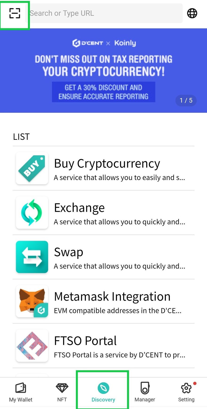 Step 3: Now, open your preferred Android wallet, such as D’cent Wallet, and navigate to the “Discovery” tab. Tap the scanner button at the top left corner to scan the QR code displayed on your app’s interface. Here, you will see the scanner option at the top-left corner, click on that icon and scan the OR code of the D’cent app.