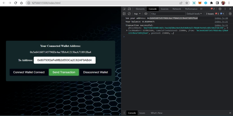 In this code I have hardcoded the value of amount which is “0.001” XDC, you can change it according to your preferences or you can make it dynamic by adding another input for amount and can handle it, in the backend as I have handled “receiver’s address”.