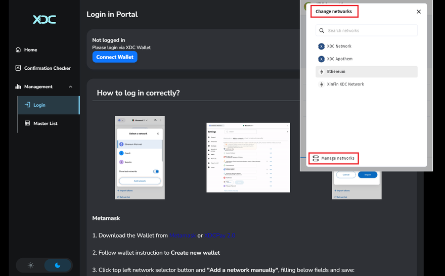 - Click on "Change Network" and then "Manage Network" button.