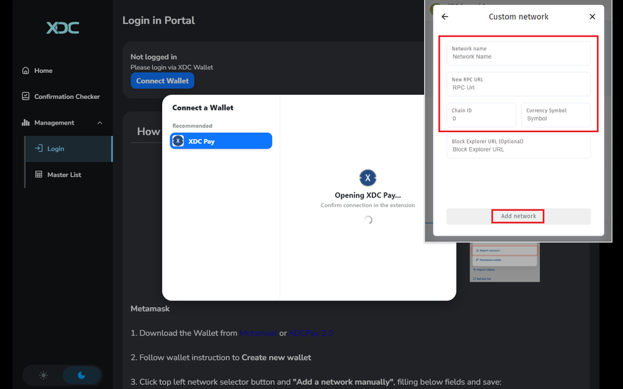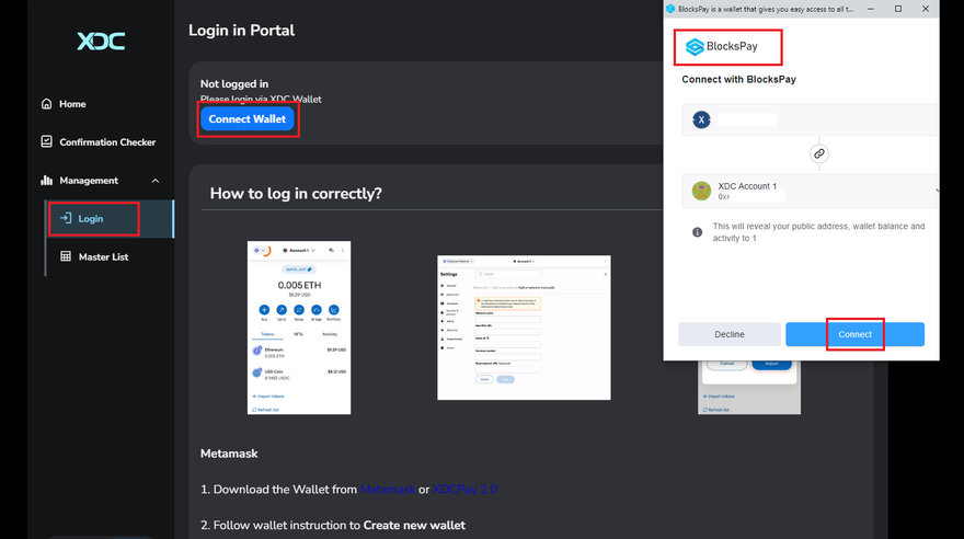 Step 6: Once you are on Login Portal, click on the "Connect Wallet" button to connect the XDC Network using BlocksPay Wallet and Click on the "Connect" button of BlocksPay screen.